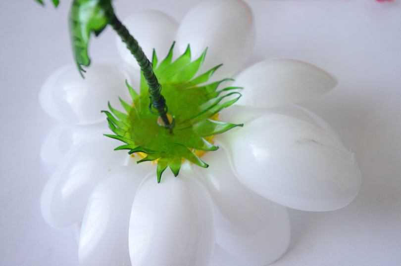 Проволоку просовывают в отверстие в пробке и закрепляют. Получится белая ромашка. Проволоку можно воткнуть в кусок пенопласта. Из другой зелёной бутылки получится вырезать листья и скрепить их степлером или клеем к стеблю.