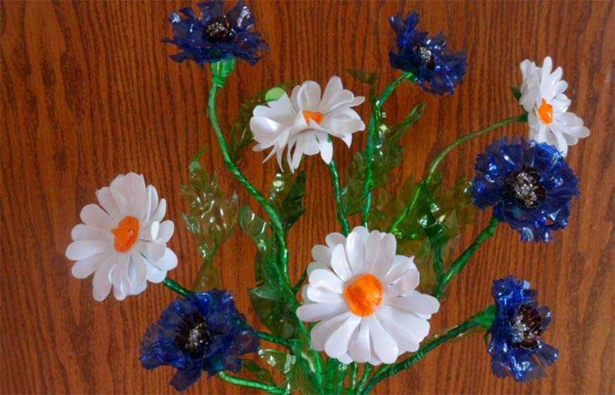 Украсить спальню школьника или детскою комнату поделками из пластиковой тары не составит труда. Можно соорудить целый букет искусственных цветов. Получившиеся хризантемы, ромашки или розы поставить в вазу из того же материала, дополнив серединки диодными лампочками на изолированном проводе. Так будет выглядеть ночник необычайной красоты, где слабый свет переливается в пластиковых лепестках.