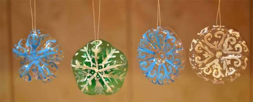 Яркие новогодние шары, гирлянды или игрушки из пластиковых бутылок – достойное применение для прозрачной тары. Из одной бутылки, нарезанной на круглые полоски, выйдет прозрачный шар. После закрепления сферы степлером декорируйте любым способом: