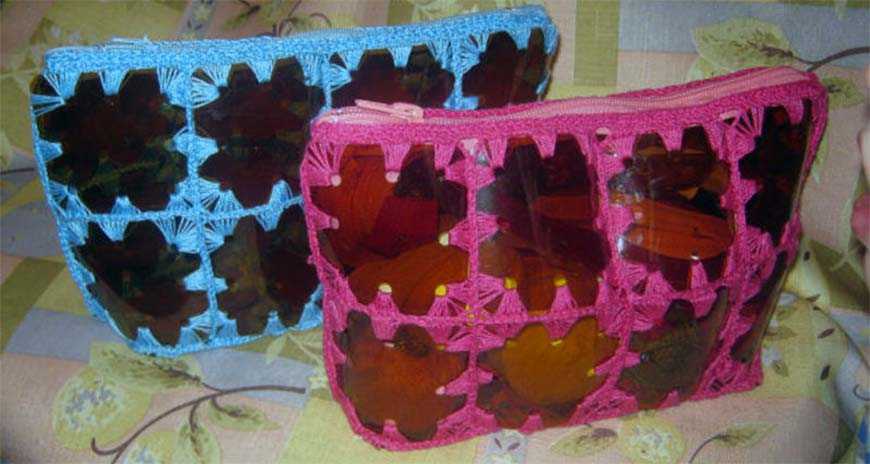 Оригинальную косметичку смастерите из 2-х донышек пластиковых бутылок, сшивая края на молнию. Эту шкатулку можно использовать как многофункциональный предмет – копилка, чехол для крупных бус, заколок или бижутерии.