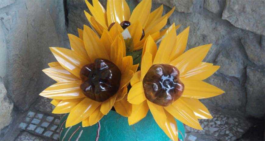 Можно также внутрь вазы вставить стеклянный или пластиковый сосуд. Такую поделку из отходов в школу можно принести.