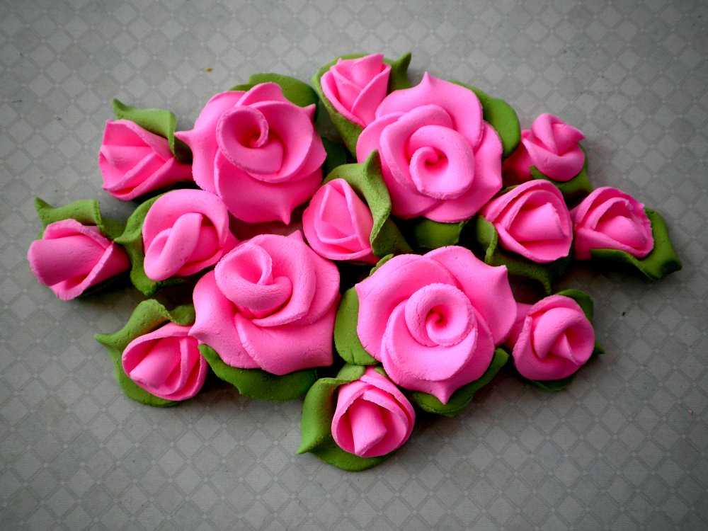 Вот такими розами можно украсить праздничный торт. Для бутонов используется розовый краситель, для листиков – зеленый.
