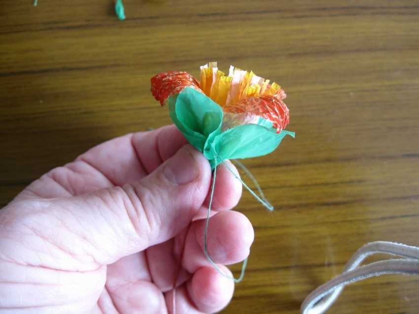 Складываем 5 фантиков вместе, находим у «гармошки» серединку и прошиваем иголкой с ниткой одну петлю;