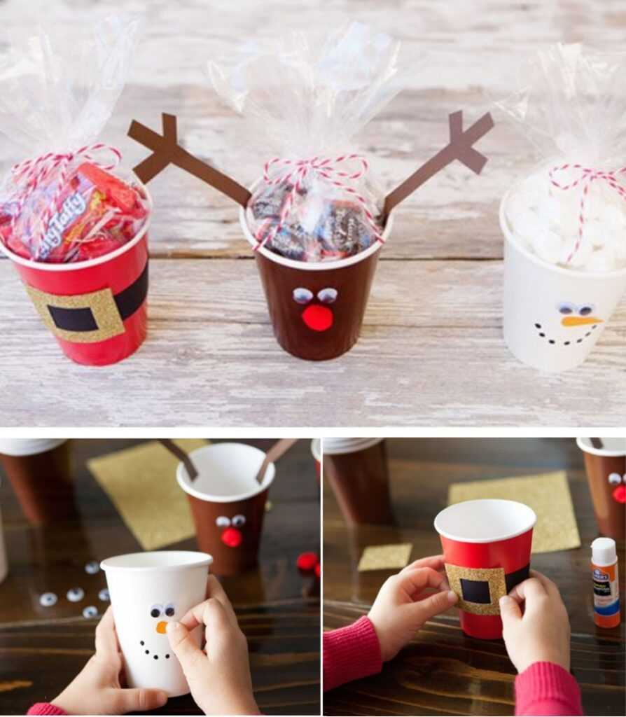 К Новому Году из стаканчиков можно изготовить сладкие подарки, украсив их с помощью аппликации
