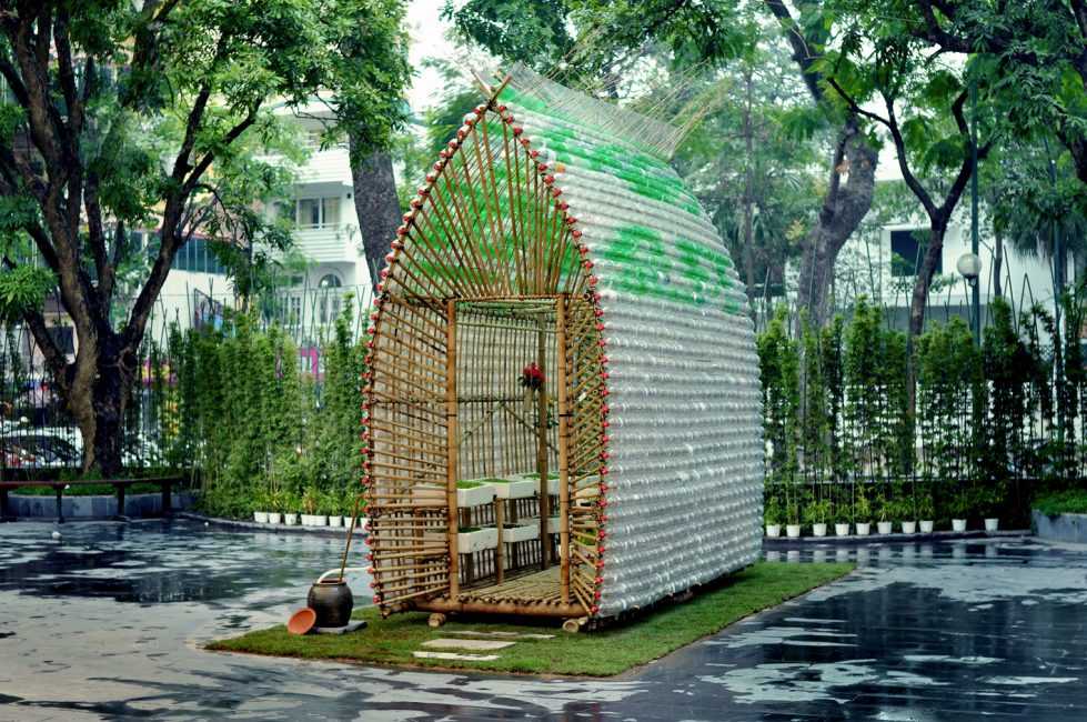 Как не странно, из пластиковой тары можно делать не только элементарные вещи, но и целые сооружения, такие как беседки на даче. Перед этим, желательно выделить помещение, в которое будут складываться бутылки для будущей постройки, так как их понадобится очень много.