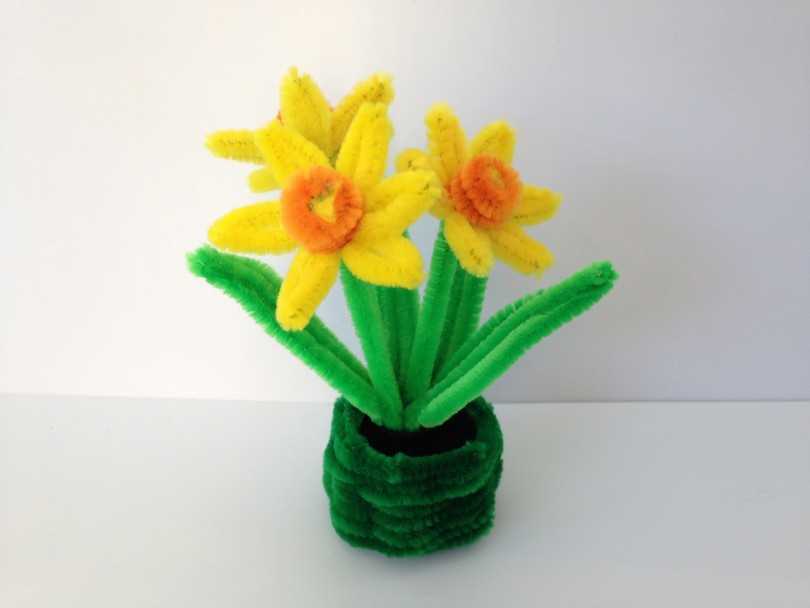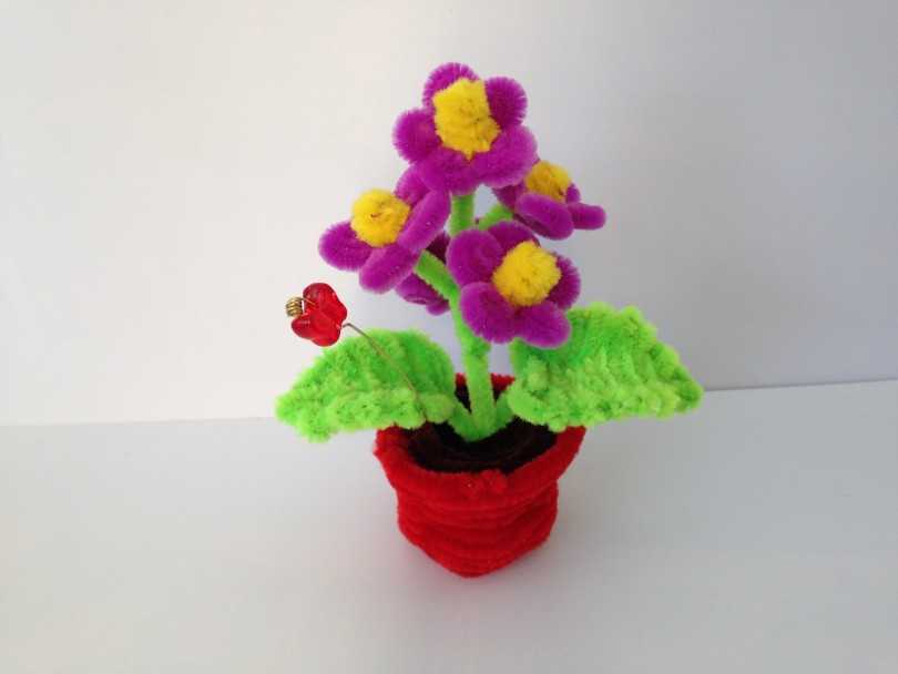 - Положите в цветочный горшочек кусок пенопласта, засыпьте его рисом или искусственным материалом, вставьте заготовленные ранее цветы из синели и у вас декоративное украшение, которое подойдет для любого интерьера.