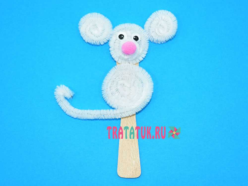 Данный вариант мышки – для самых маленьких. Смастерить ее очень легко, нужно свернуть две проволоки в спиральку, добавить мелкие детали и мышка готова. Впоследствии ее можно приклеить к палочке от мороженого, либо на бумагу.
