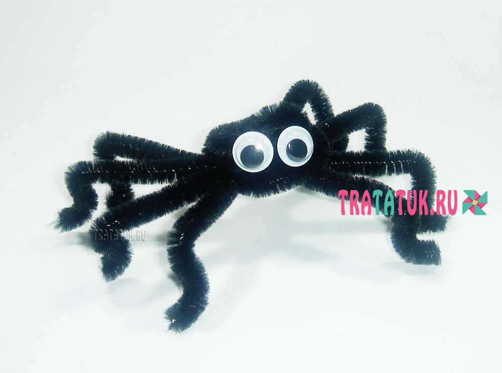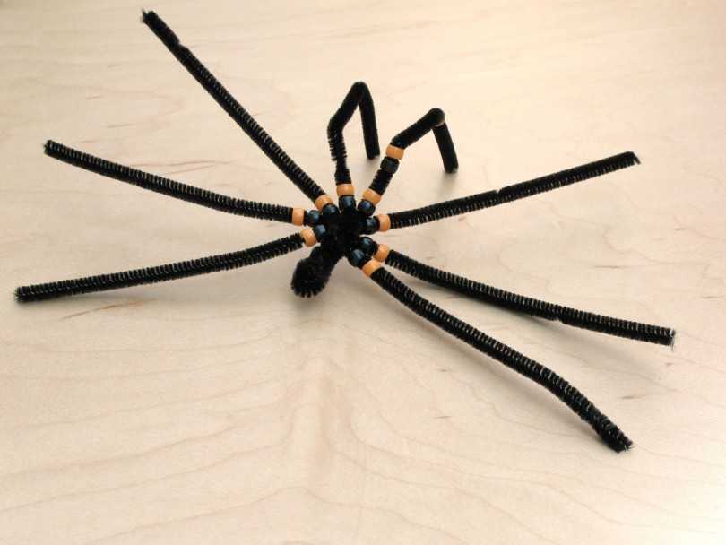Для паучка нам потребуются 5 пушистых палочек одинакового цвета и длины. Нужно соединить 4 штучки вместе, обкрутив пятой посередине. Осталось отогнуть лапки, и паук готов. Варьируя длину отрезков, можно очень быстро смастерить целую семейку пауков из синельной проволоки. Это одна из самых простых рукоделочек.