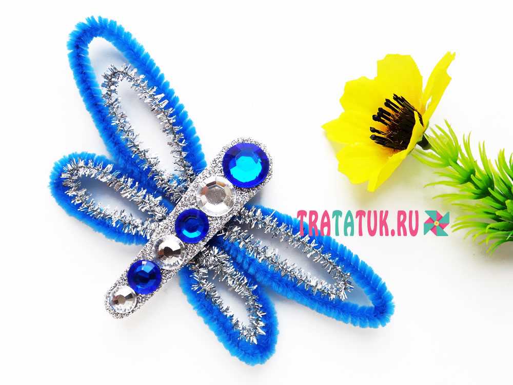 Красивое, яркое насекомое сделано из голубой и серебристо-блестящей синельной проволоки, а также серебристого фоамирана и стразов, идеально дополняющих работу. Такая стрекоза — это не только поделка, но и уже готовое декорирующее изделие.