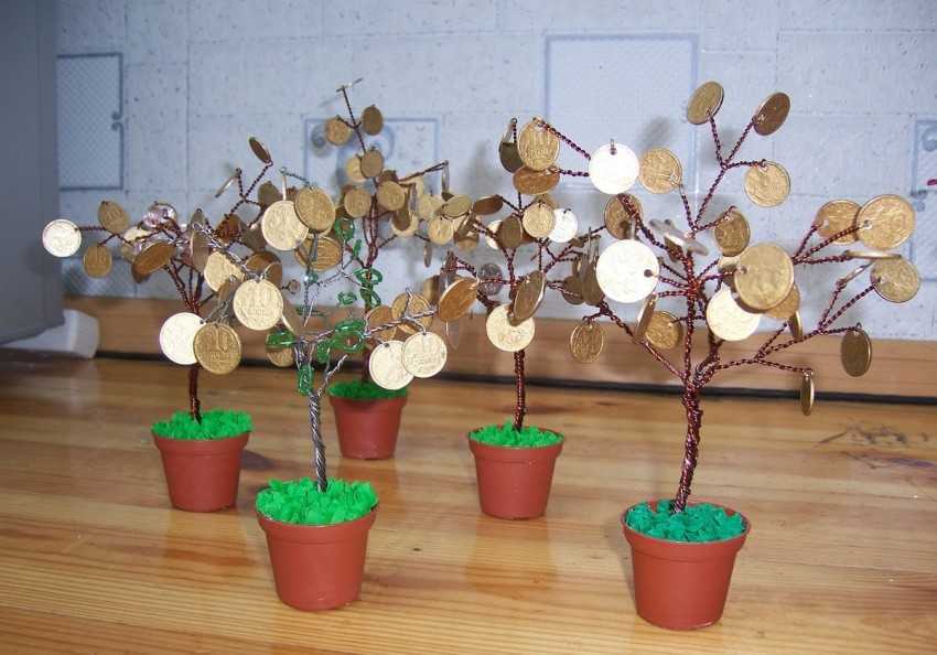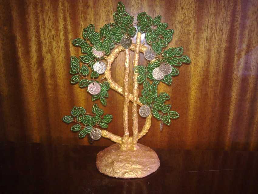 Необходимо нарезать проволоку одинаковой длины и толщины. Затем нужно переплести между собой детали проволоки, оставляя часть для веток. На ветки дерева нужно нанести бисер. Нижнюю часть денежного дерева закрепить с помощью какого-либо основания, либо с помощью небольшого цветочного горшка.