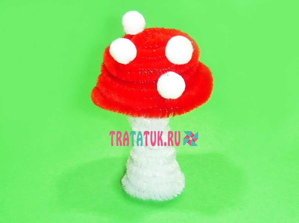 И снова беспроигрышное сочетание – синельная проволока и помпоны, да и еще в таких классически ярких тонах – красном и белом. Мухоморчик украсит любую осеннюю композицию. Да он и сам по себе – отличная идея детской поделки.
