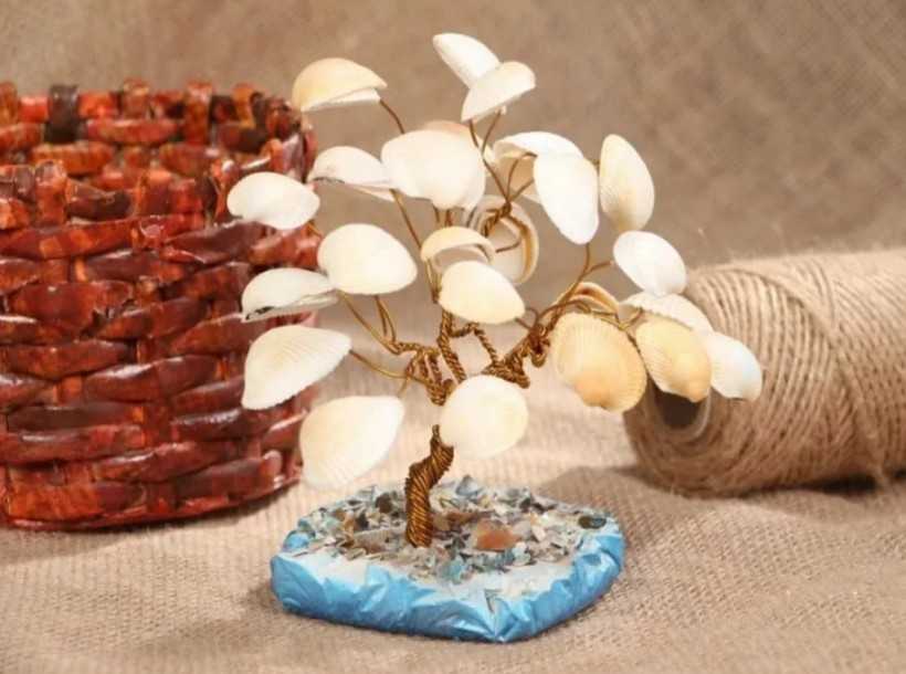 Топиарии из ракушек – круглое деревце с основой из пенопласта, которое обклеивается ракушками, жемчужинками и другими декоративными элементами.