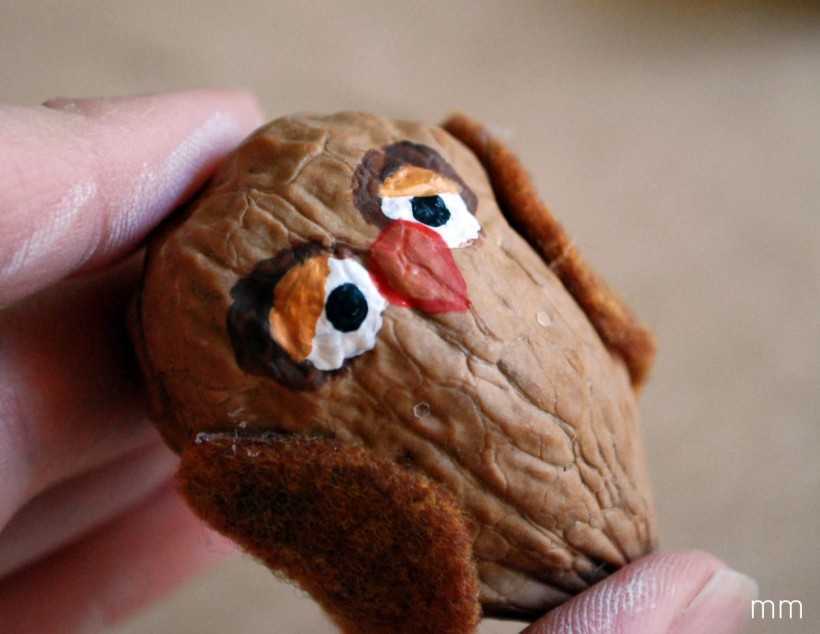 Из скорлупы грецкого ореха можно сделать забавных щенков на привязи.
