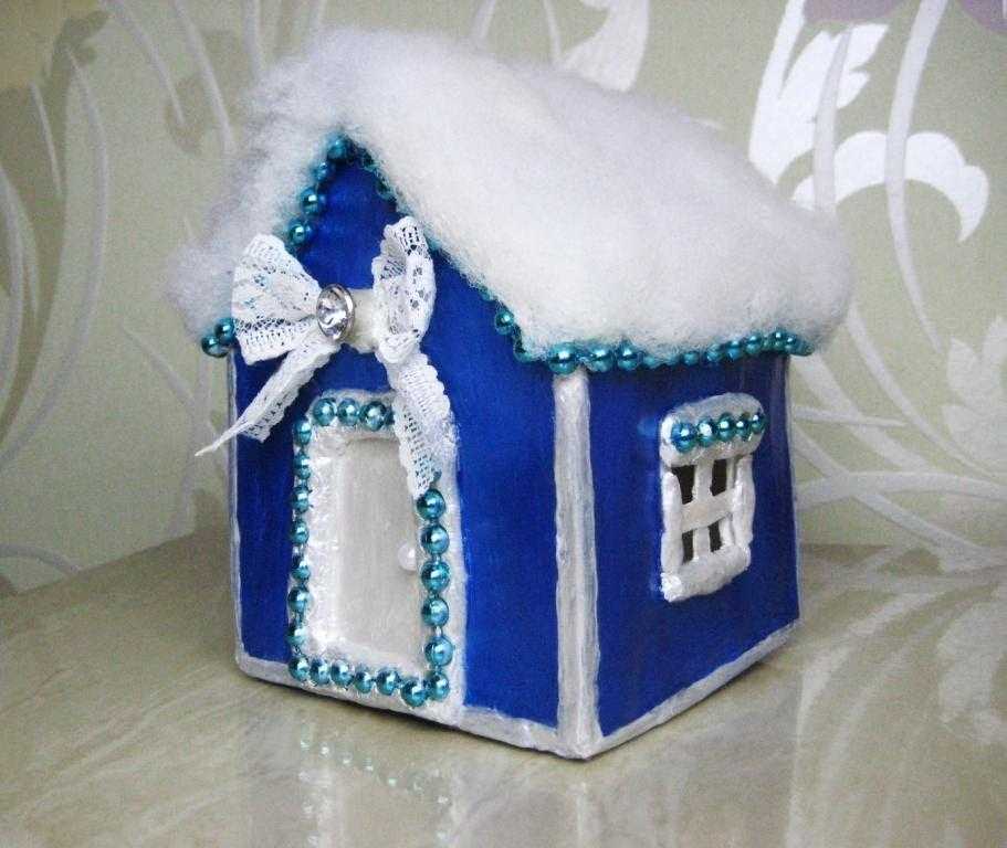 Если сделать несколько похожих домиков, можно сделать целую зимнюю улицу. Вместо снега используйте вату, также можно применить небольшие веточки елей, вырезанные фигурки людей. Платформой для этой поделки может стать коробка от обуви.