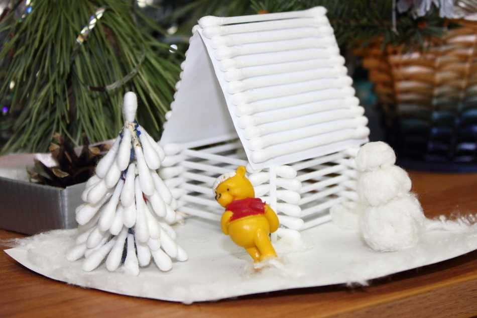 Из ватных палочек можно сделать целую композицию, которая будет представлять собой зимний заснеженный домик.