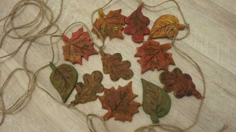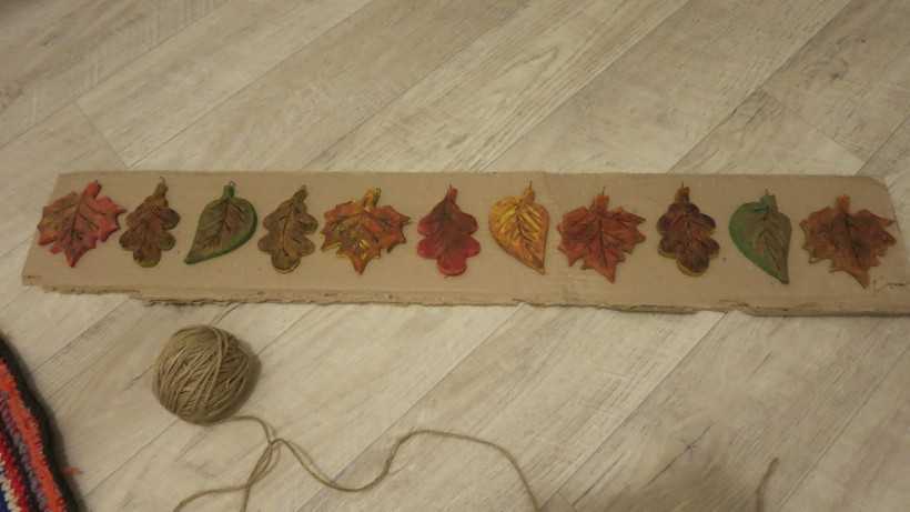 - Нанизать листья на верёвку, завязывая узелок над каждым листом. Поделка готова!