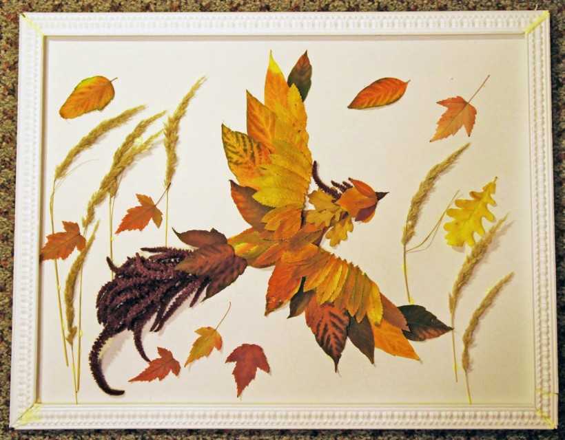 - Осеннее панно из сушеных листьев, камышей и ягод