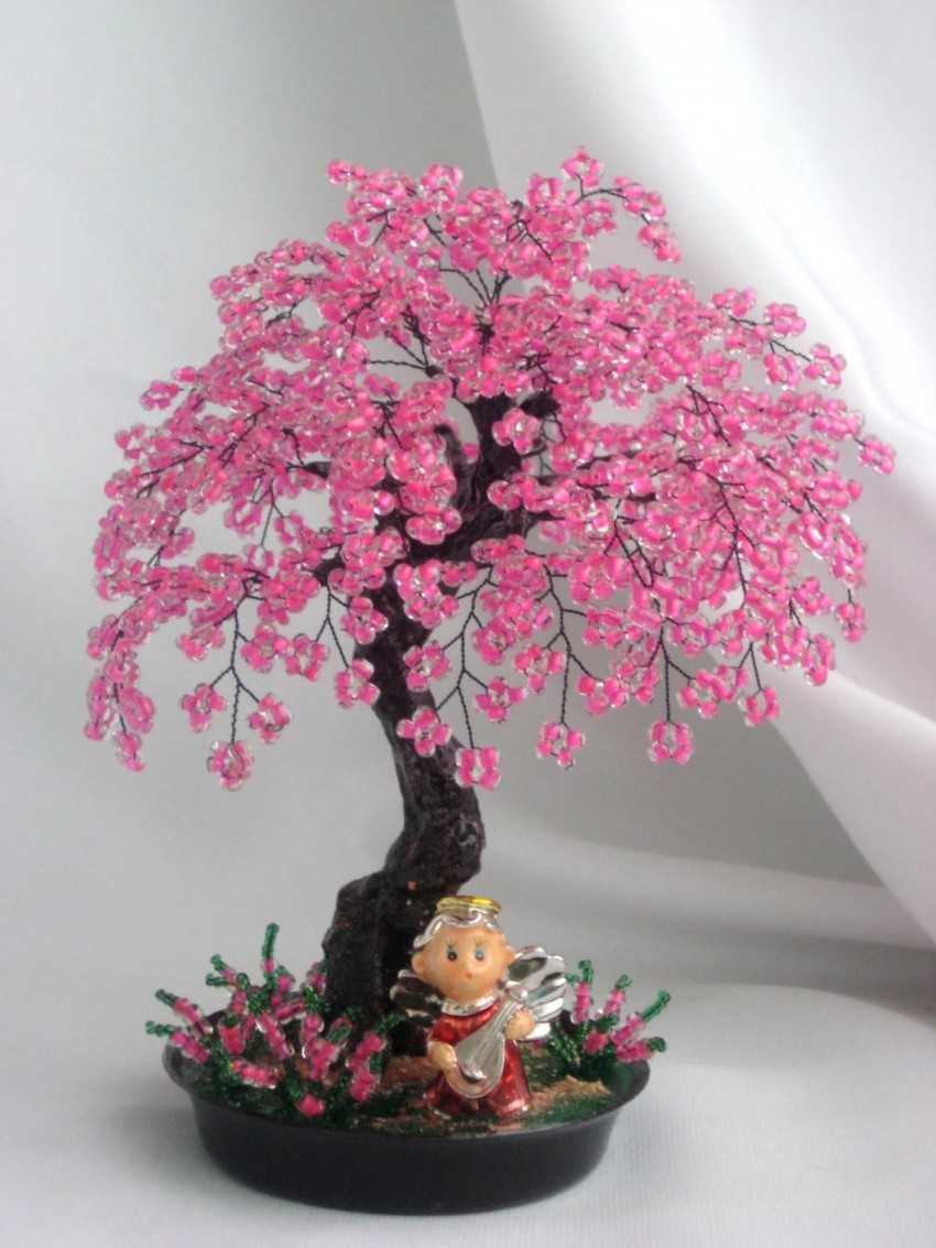 Отличным украшением станет сакура, вышитая или сделанная из бисера. Берем бисер и нанизываем его на проволоку – так формируем ствол и ветки. Украшаем изделие розовыми бусинками (цветы) и устанавливаем его в горшок. Придать устойчивость конструкции помогут стеклянные шарики, насыпанные у основания ствола.