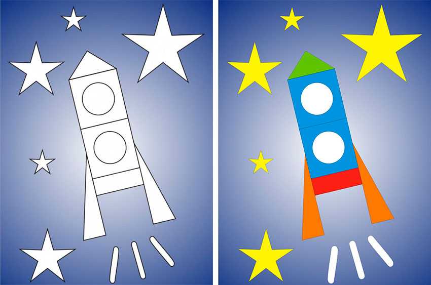 В создании аппликации используйте не только бумагу, но и другие материалы. Например, огонь, вырывающийся из сопла ракеты могут имитировать нити.