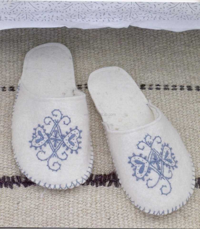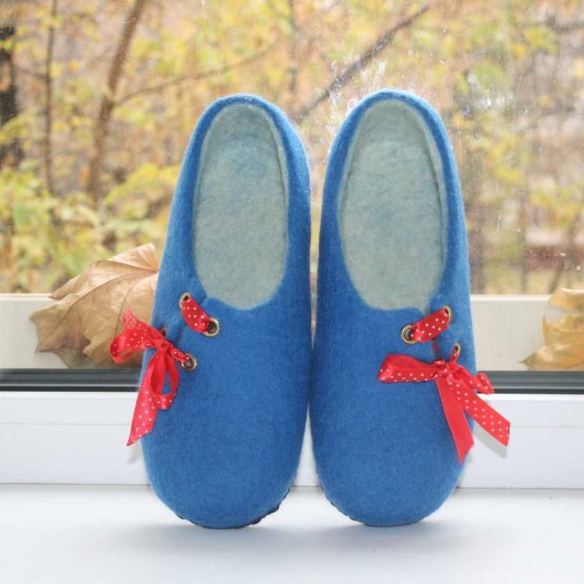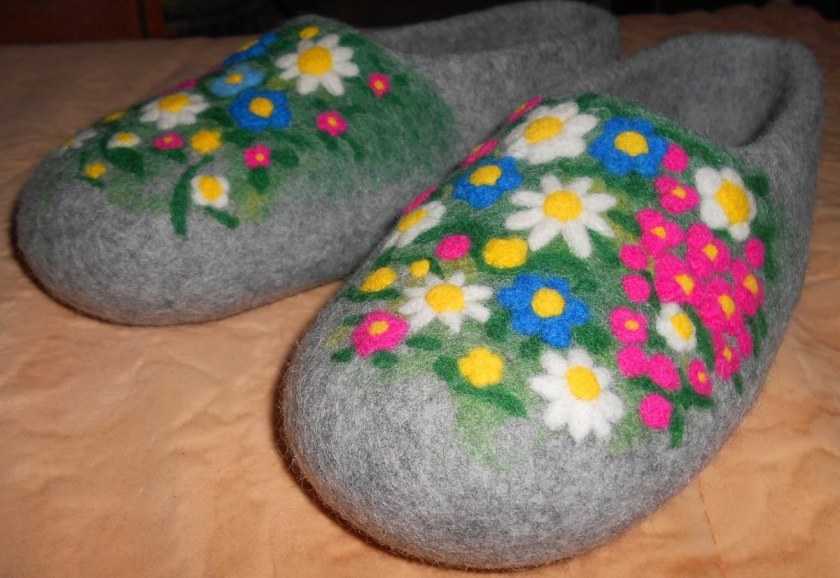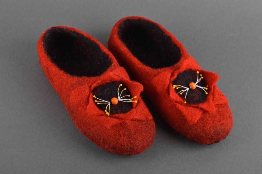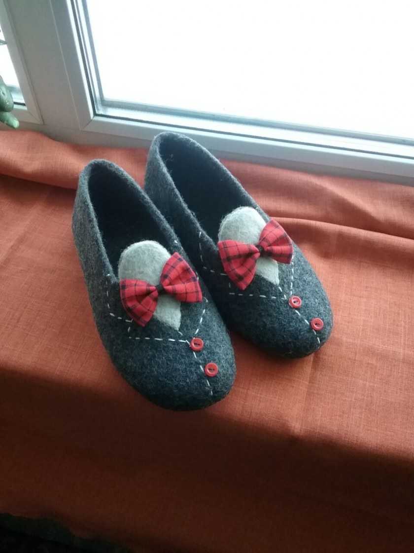 Какой бы вы не выбрали способ, войлочные тапочки в любом случае будут теплыми и уютными. Украсить их можно лентами или рисунком. Орнамент или забавная картинка может быть выполнена в технике валяния или вышита, также можно пришить готовую фабричную тематическую нашивку.