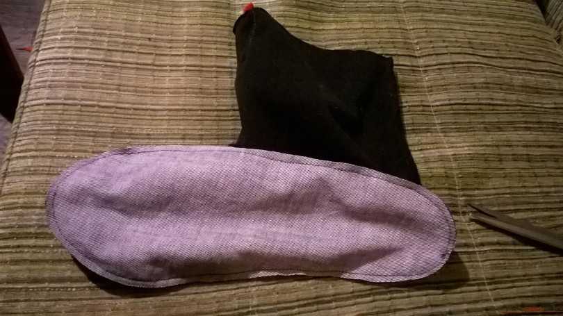 А теперь внимание! Идеально было бы просто прострочить по этому срезу, просто сшить одним швом три слоя ткани, но не тут то было…ведь тогда тапок не вывернуть уже…