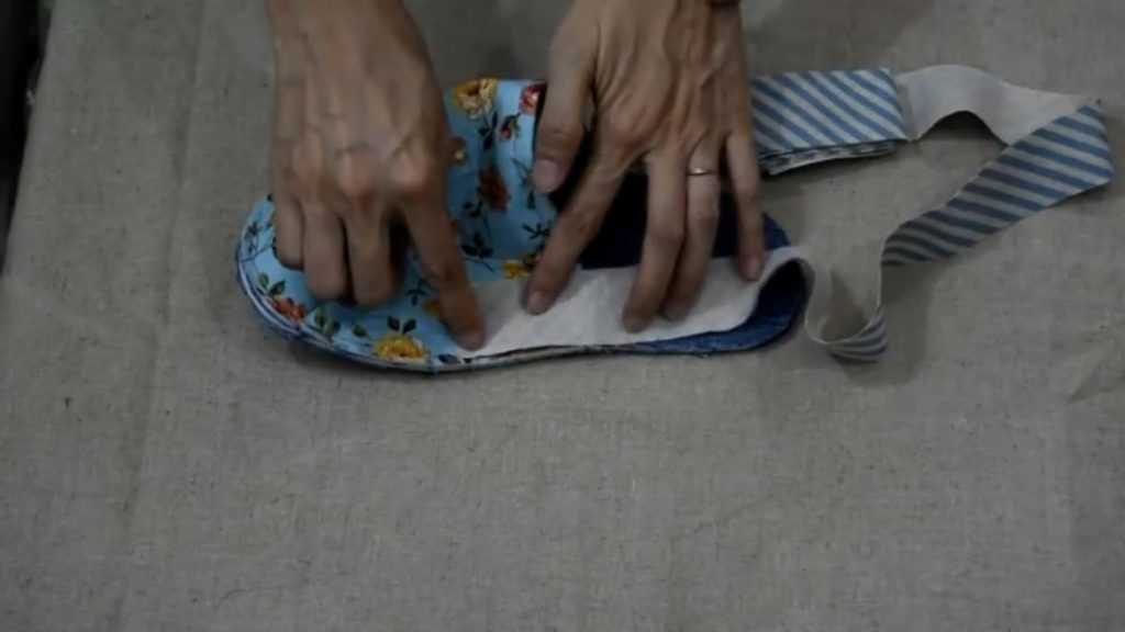 – Следующим этапом будет – выворачивание заготовки тапочек на лицевую сторону. После чего в нее нужно поставить подошвы: картон, а поверх него поролон. Не перепутайте, так как лучше иметь под ступней удобную подошву из поролона.
