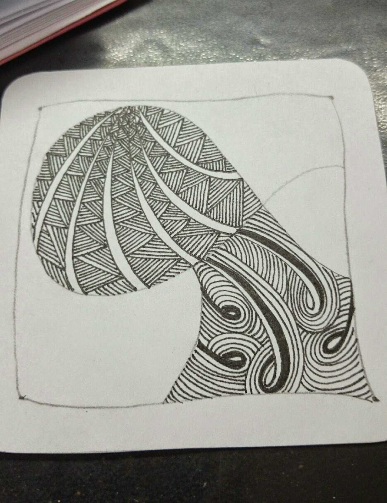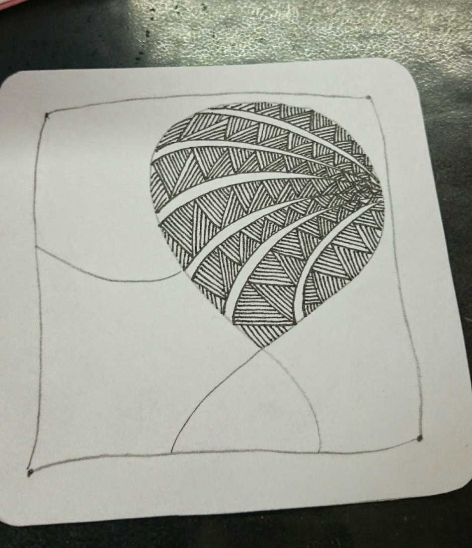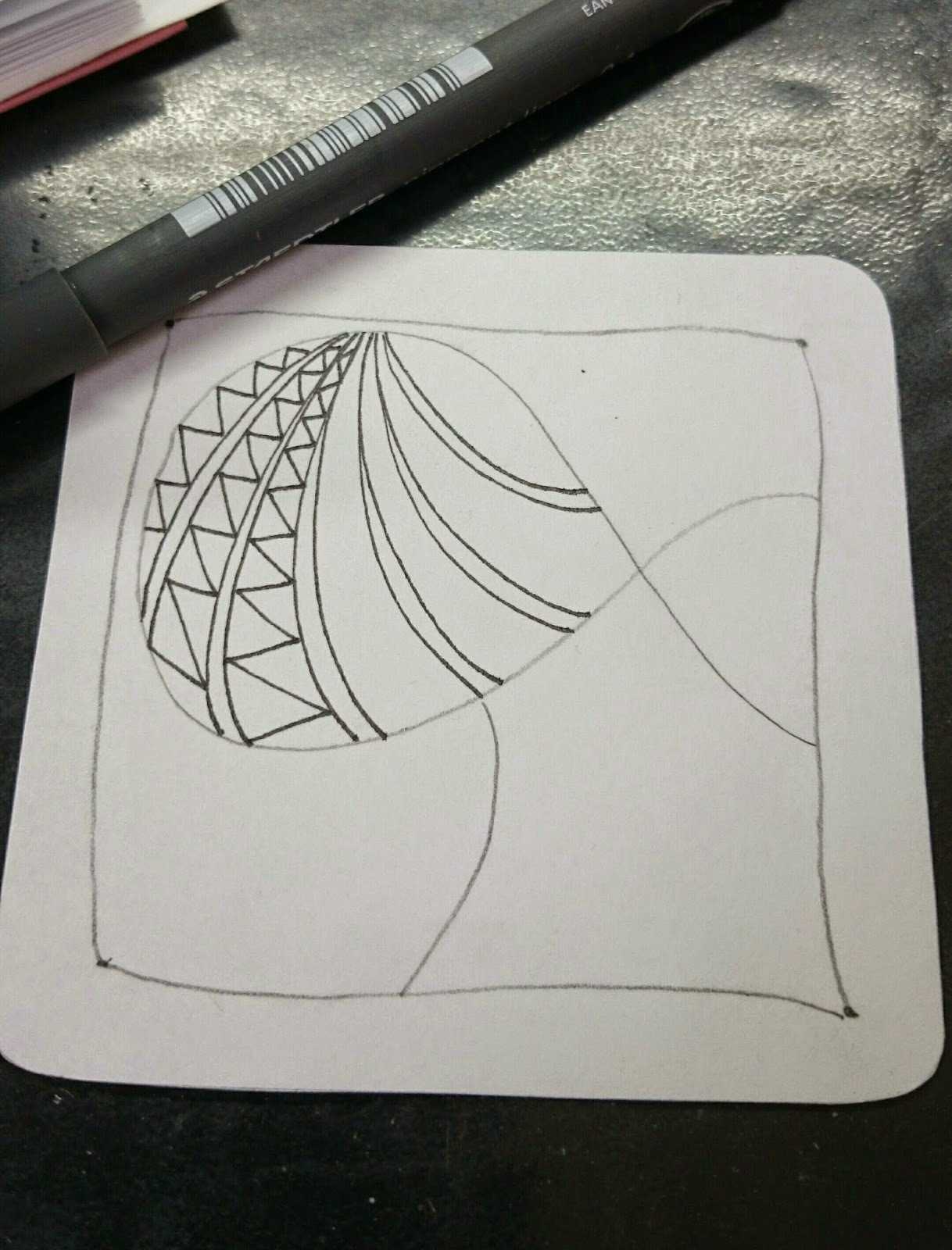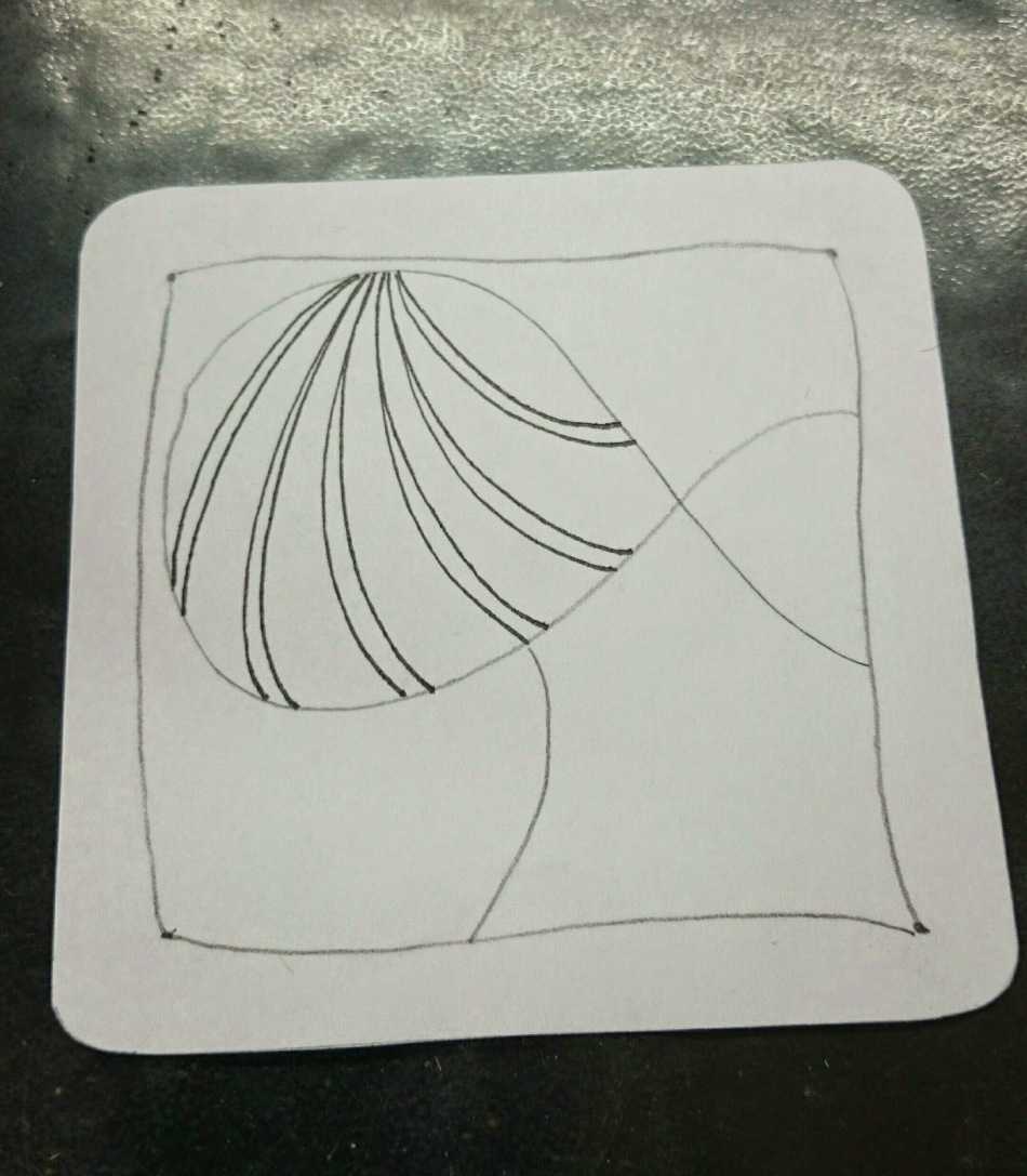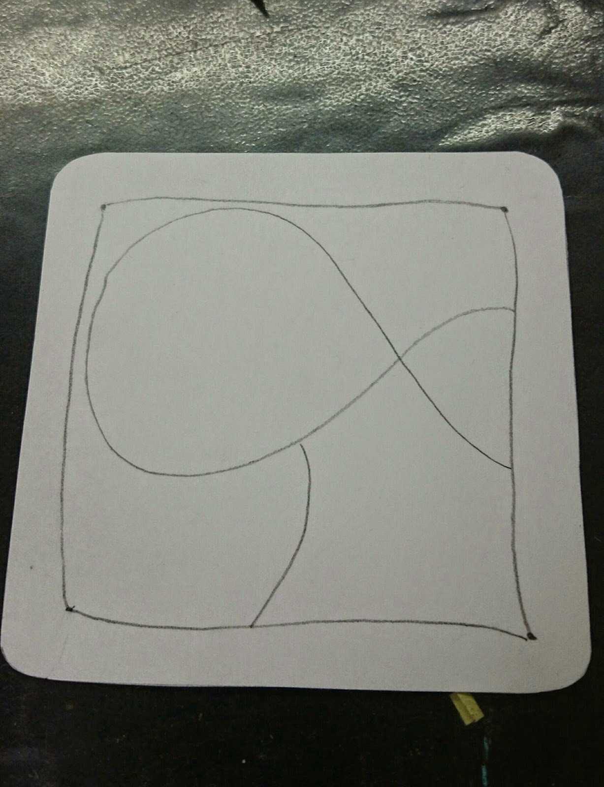 Дальше необходимо будет карандашом нарисовать кривую линию, которая разделит участок листа внутри границы, она же и решит сколько видов узора и танглов вы сможете нарисовать внутри