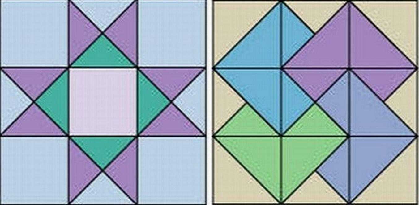 Пока вы только делаете первые шаги в пэчворке, вам проще будет работать с простыми фигурами – треугольниками и квадратами. Схемы тоже выбирайте на первых порах не очень сложные. Вот примеры: