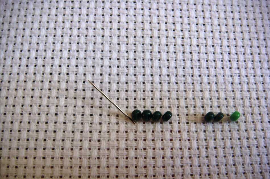 Вприкреп. Часто называют ленивым стежком. Его выбирают, когда бисер мелкого размера и внутреннее отверстие не пропускает иглу с ниткой дважды. Выводите иглу на лицевую часть, нанизываете сразу несколько бисерин и прикрепляете к ткани. Вторым шагом надо дополнительно прихватить бисерную нить к материалу. Через каждые 2-3 бусины прикрепляете основную нить стежком к лицу. Такой вариант намного быстрее остальных стежков. Обычно применяется для оформления контура на ткани с рисунком, создания нескольких параллельных линий внутри узора.