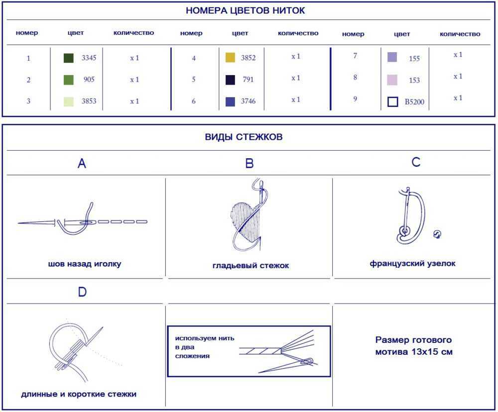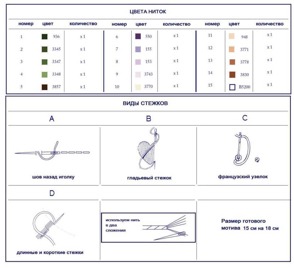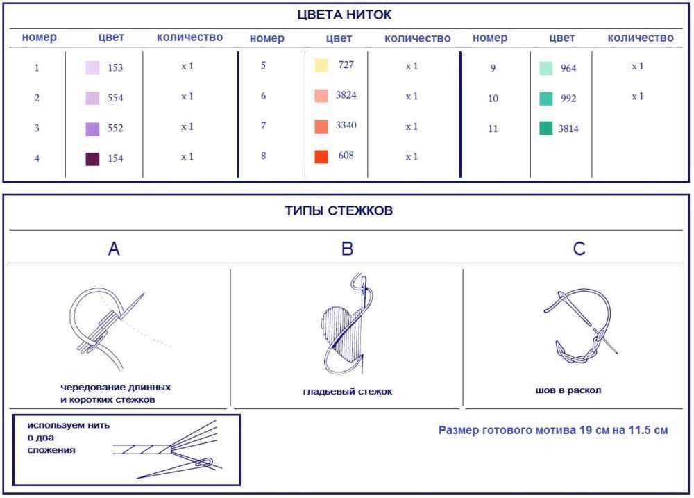 Расход количества ниток в таблице рассчитан исходя их размера готового мотива 15 на 16 см.
