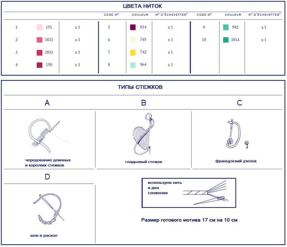 , пышечка (), чередование , тамбурный шов, стебельчатый стежок, . Всю технологию выполнения швов для вышивки вы найдете в этом разделе. На схеме указаны буквами типы стежков, а цифрами – цвет и размер ниток.