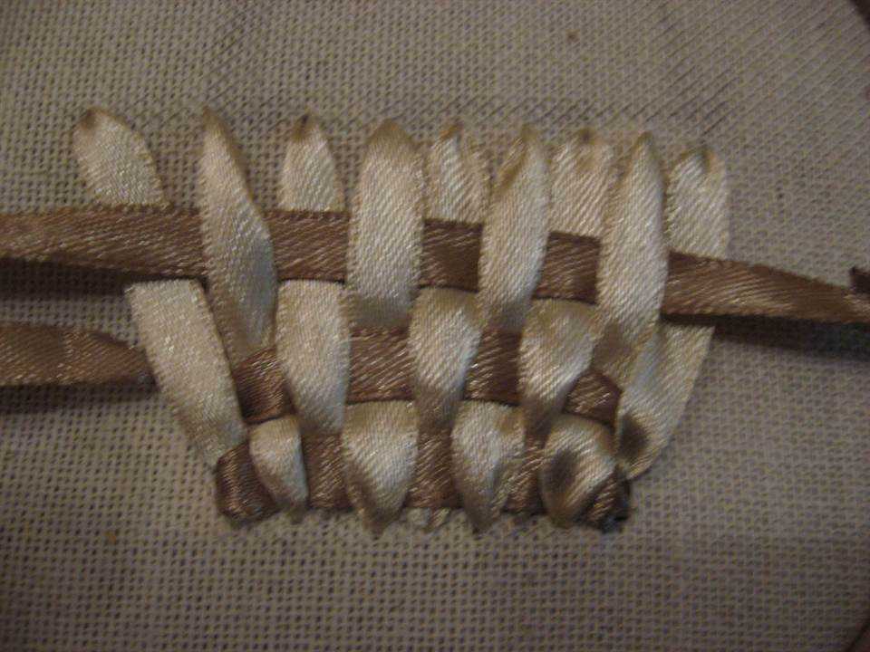 Листья вышиваем тем же базовым швом, а для корзинки применяем переплетение прямых стежков лентами коричневого и бежевого цвета.