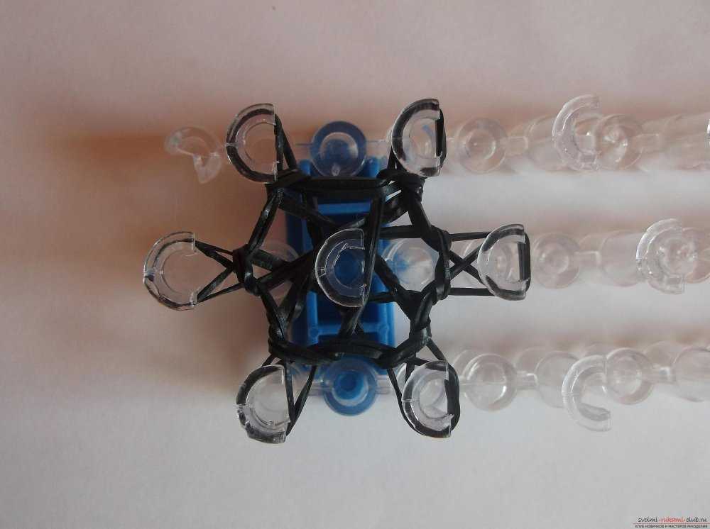 Резинку нижнего ряда нужно перекинуть протянуть через верхние и снять. Потом на центральные колышки опять надевается резинка, а петельки, находящиеся под ней с обеих сторон, снимаются. Работаем дальше по этому принципу. На боковые штырьки накидывается по одной резинке, и снова снимается нижний слой.