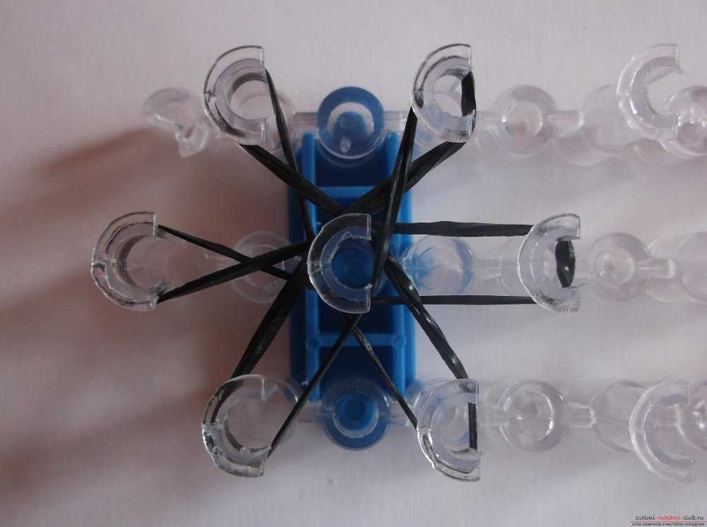 - Проплетите их (перекиньте) и, следуя схеме, сплетите первый ряд, вертикально накидывая резинки поверх столбиков станка.
