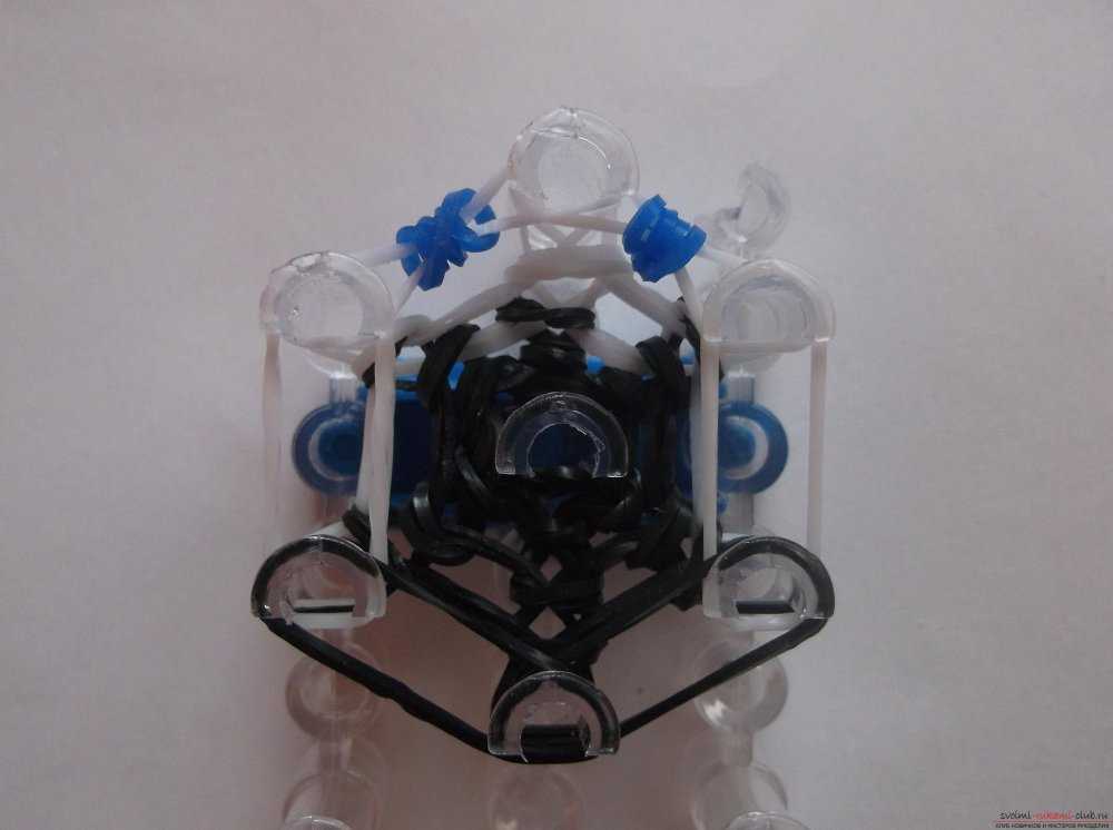 Повторяем плетение с п. 11 по п. 13 – один раз. Затем переносим резинки с одного среднего зубца на второй, причем так, чтобы этот перенос был одинаков по обеим вилкам.Надеваем одну черную резинку на четыре зубца лицевой вилки. Затем надеваем по две черные резинки на боковые зубцы и средний зубец, где есть резинки.Переносим черную резинку на середину плетения. Нижние резинки перекидываем через зубцы/Резинку на среднем зубце подцепляем и растягиваем на второй зубец.Резинки с боковых зубцов снимаем и надеваем на средние зубцы.Делаем хитрую резинку для клюва пингвина.Надеваем хитрую резинку (красная резинка на лицевую вилку, черная – на оборотную вилку).Затем надеваем на средние зубцы по две черные резинки.Продолжаем плетение нашей поделки из резинок. Скидываем нижние черные резинки в середину плетения.На лицевой стороне черные резинки на средних зубцах переносим на боковые.На оборотной вилке черные резинки (верхние) на средних зубцах переносим на боковые.На запасной крючок накручиваем две синие резинки, причем каждая – по четыре оборота – это будут глазки пингвина.Подцепляем крючком черную резинку и переносим на нее синие резинки.Надеваем резинку с глазками на боковые зубцы лицевой вилки, разделяем витки синей резинки на две части.Одну резинку из средней части резинки с глазками переносим за средние зубцы.