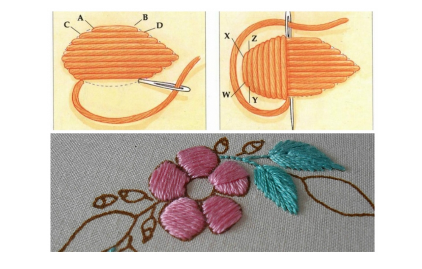 При формировании цветка стежки направляются от контура к центральной части. Наклонные стежки используются для вышивания стебельков и усиков растений. Наглядно это можно увидеть на схематичном рисунке.