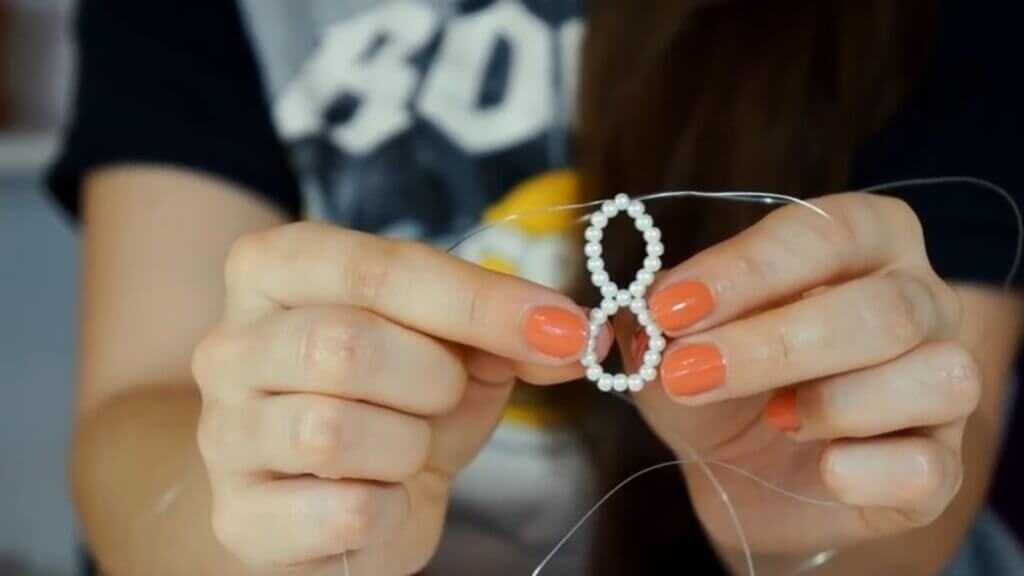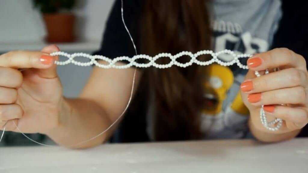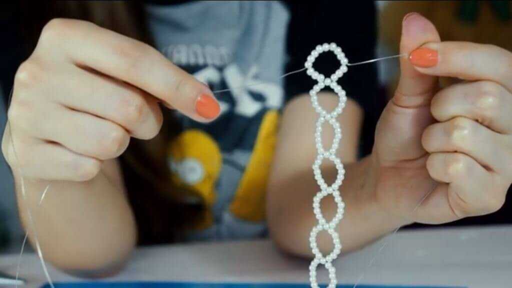 Еще одна популярная основа – леска. Она не так жестко держит форму, поэтому ее чаще используют для плетения мозаик и сеточек. Очевидные плюсы лески – прозрачность (не нужно подбирать цвет) и чемпионская устойчивость к воздействию пота.