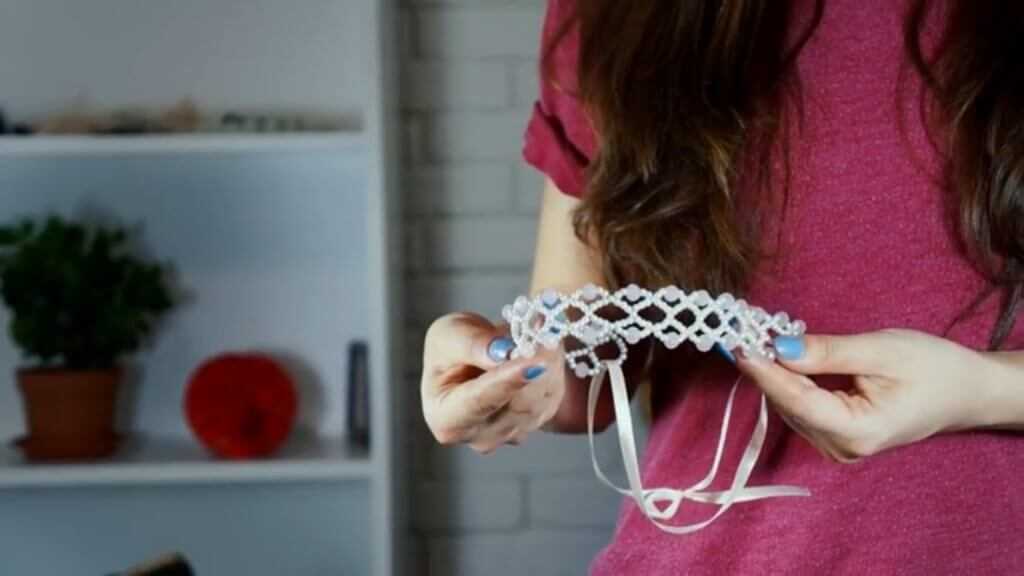 Есть более сложный пошаговый мастер-класс по изготовлению короны – диадемы из бусин. Для неё за основу нужно взять ненужный ободок. Сама диадема состоит из 15 элементов. Лучше взять бусины формы рондель. Отрезок проволоки диаметром 0.3 мм закрепляем на ободке посередине. Далее нанизываем на неё 15 бусин, которые можно чередовать по размеру. Другой конец также закрепляем на ободке, должна получиться своеобразная капля или дуга. Далее нанизываем 11 бусин на проволоку, предварительно заведя проволоку в центр дуги, образуем из этой части дугу.