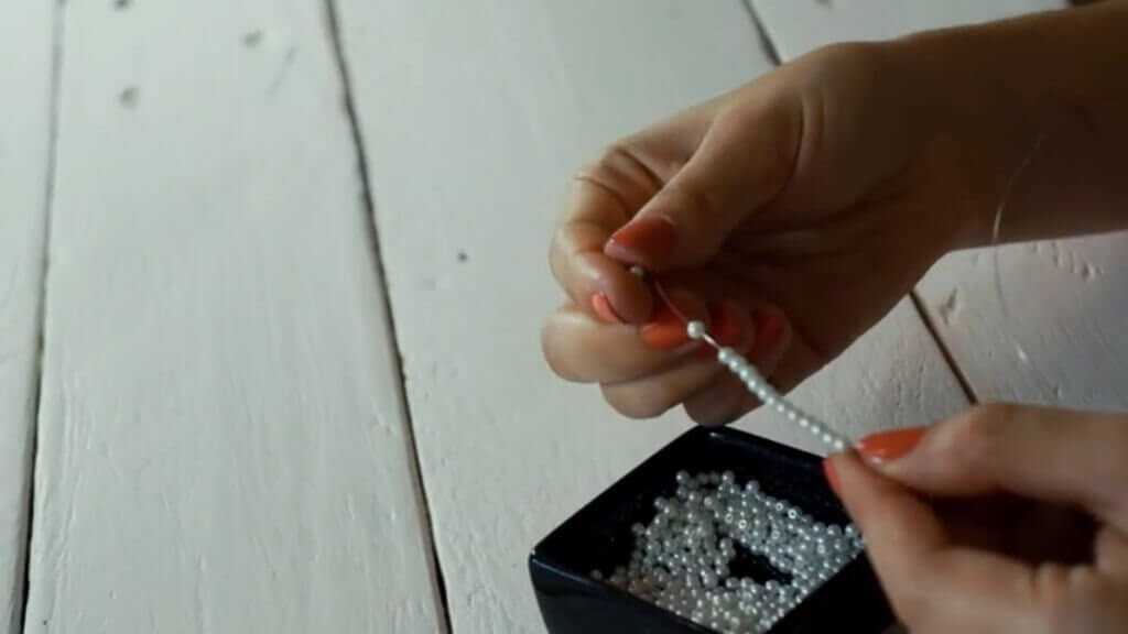 Нанизываем на проволоку 16 бусин. Размещаем их на середине проволоки.