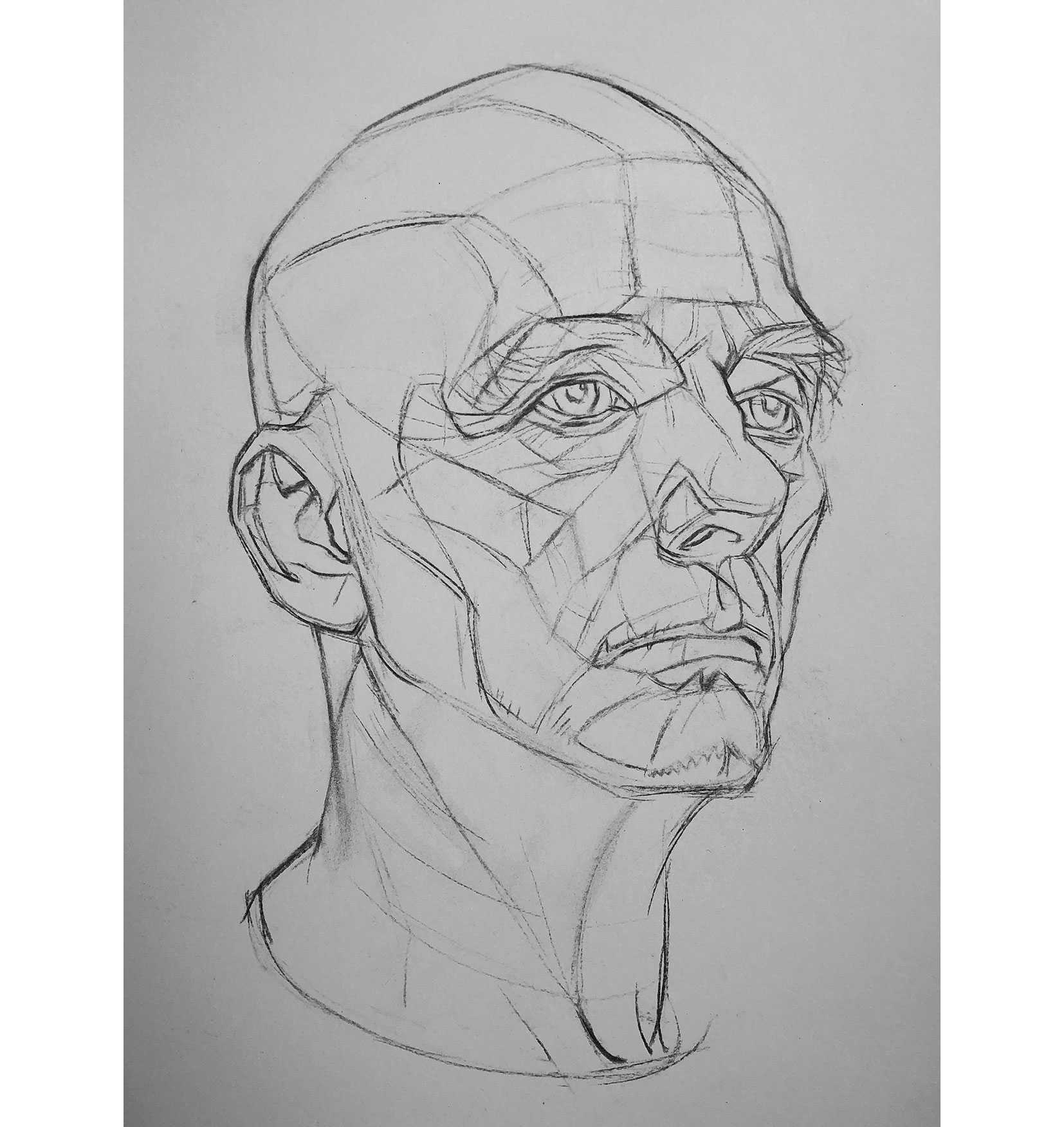 Продолжайте использовать прямые линии, чтобы обозначить большие теневые области, такие как глазницы. Я обычно начинаю с формы глазниц, затем рисую основу формы носа, а после форму рта. Обозначьте примерные формы контура головы и отметьте брови