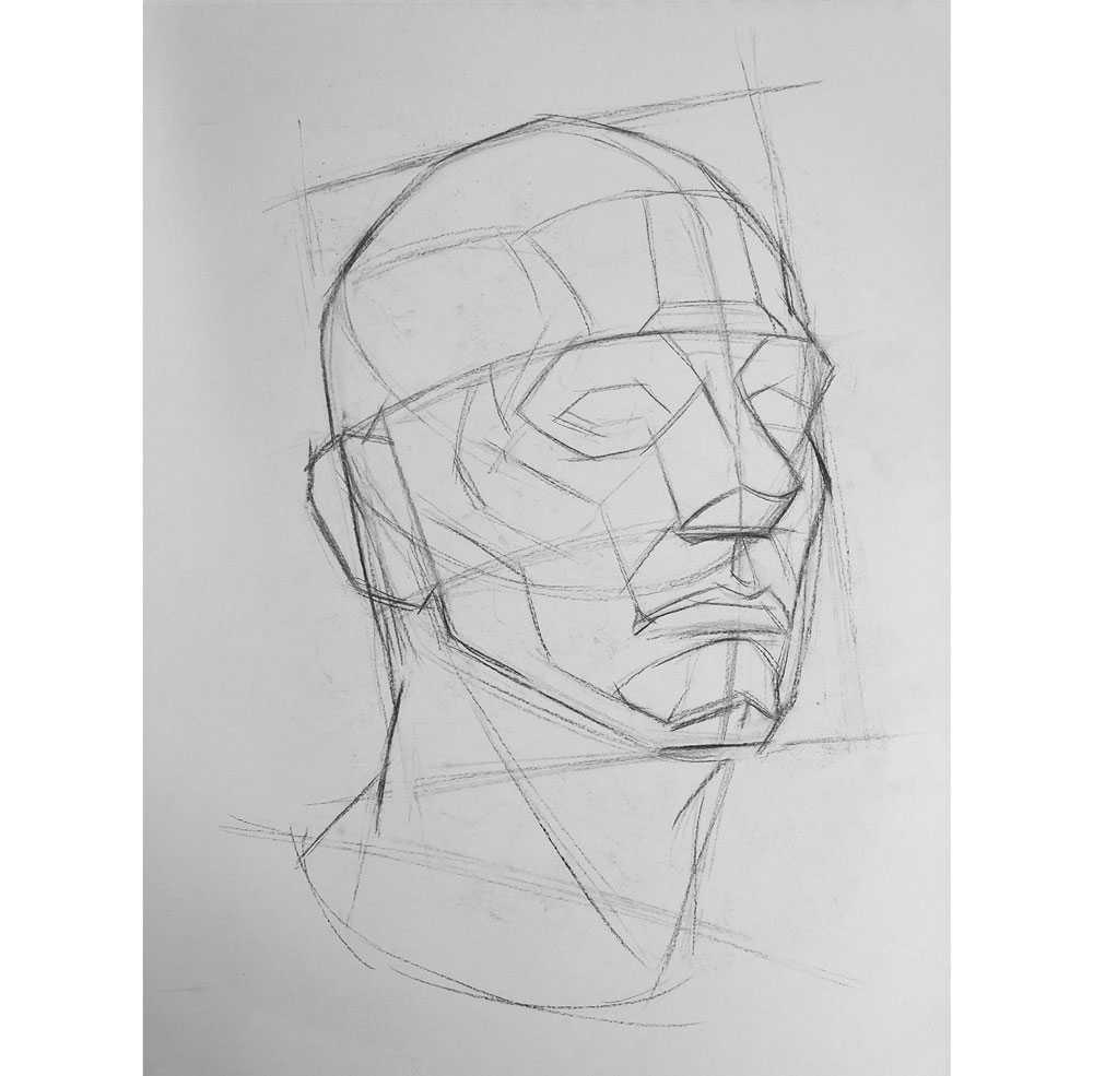 Используйте виноградный уголь, чтобы обозначить положение головы, отметив верхнюю, нижнюю и боковые границы прямыми линиями. Прямые линии позволяют вам наблюдать за объектом в целом и исследовать взаимосвязи между ключевыми блоками, чтобы вы могли точно очертить их на бумаге.