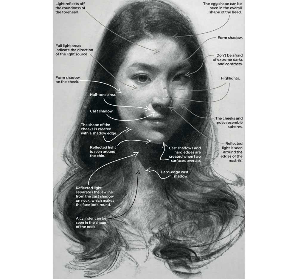 Форма и фигура тесно связаны. Вам нужно научиться воспринимать формы как трехмерные фигуры. В искусстве термин «форма» относится к объекту, имеющему длину, ширину и высоту. Всем художникам нужно развить свое понимание формы. А изучая влияние света на предметы вы без труда сможете создавать иллюзию формы в портретных рисунках. Я предпочитаю верхнее освещение в портретах. Этот тип освещения выделяет плоскости, обращенные верх, и отбрасывает сильные тени. Учтите, что для освещения головы в портретном рисунке лучше всего использовать один источник света.