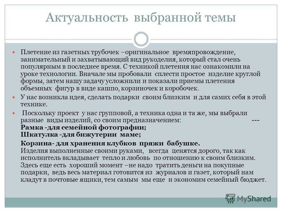 Актуальность выбранной темы Плетение из газетных трубочек –оригинальное времяпровождение, занимательный и захватывающий вид рукоделия, который стал очень популярным в последнее время. С техникой плетения нас ознакомили на уроке технологии. Вначале мы пробовали сплести простое изделие круглой формы, затем нашу задачу усложнили и показали приемы плетения объемных фигур в виде кашпо, корзиночек и коробочек. У нас возникла идея, сделать подарки своим близким и для самих себя в этой технике. Поскольку проект у нас групповой, а техника одна и та же, мы выбрали разные виды изделий, со своим предназначением: — Рамка -для семейной фотографии; Шкатулка -для бижутерии маме; Корзина- для хранения клубков пряжи бабушке. Изделия выполненные своими руками, всегда ценятся дорого, так как исполнитель вкладывает тепло и любовь по отношению к своим близким. Здесь еще есть хороший момент –не надо тратить деньги на покупные подарки, ведь весь материал готовится из журналов и газет, который нам кладут в почтовые ящики, тем самым мы еще и экономим семейный бюджет.