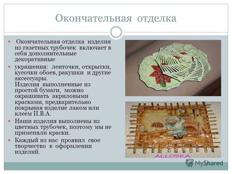 Окончательная отделка Окончательная отделка изделия из газетных трубочек включает в себя дополнительные декоративные украшения: ленточки, открытки, кусочки обоев, ракушки и другие аксессуары. Изделия выполненные из простой бумаги, можно окрашивать акриловыми красками, предварительно покрывая изделие лаком или клеем П.В.А. Наши изделия выполнены из цветных трубочек, поэтому мы не применяли краски. Каждый из нас проявил свое творчество в оформлении изделий.