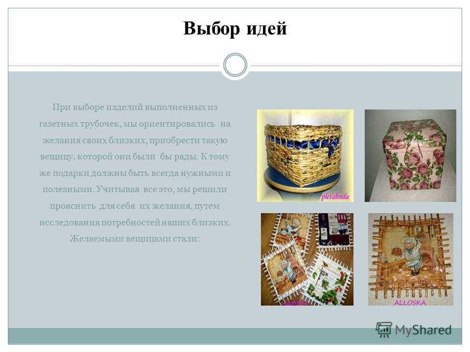 При выборе изделий выполненных из газетных трубочек, мы ориентировались на желания своих близких, приобрести такую вещицу, которой они были бы рады. К тому же подарки должны быть всегда нужными и полезными. Учитывая все это, мы решили прояснить для себя их желания, путем исследования потребностей наших близких. Желаемыми вещицами стали: Выбор идей