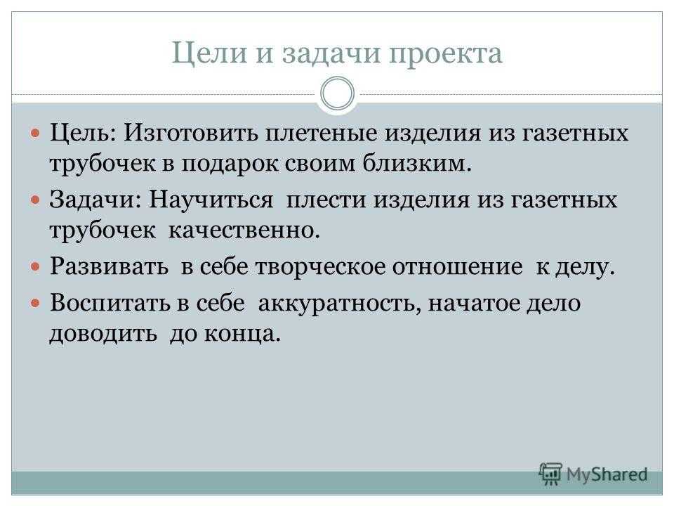 Цели и задачи проекта Цель: Изготовить плетеные изделия из газетных трубочек в подарок своим близким. Задачи: Научиться плести изделия из газетных трубочек качественно. Развивать в себе творческое отношение к делу. Воспитать в себе аккуратность, начатое дело доводить до конца.