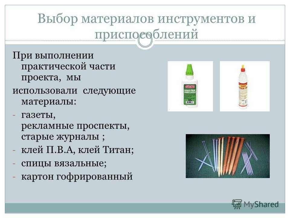 Выбор материалов инструментов и приспособлений При выполнении практической части проекта, мы использовали следующие материалы: — газеты, рекламные проспекты, старые журналы ; — клей П.В.А, клей Титан; — спицы вязальные; — картон гофрированный