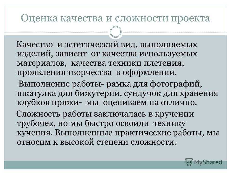 Оценка качества и сложности проекта Качество и эстетический вид, выполняемых изделий, зависит от качества используемых материалов, качества техники плетения, проявления творчества в оформлении. Выполнение работы- рамка для фотографий, шкатулка для бижутерии, сундучок для хранения клубков пряжи- мы оцениваем на отлично. Сложность работы заключалась в кручении трубочек, но мы быстро освоили технику качения. Выполненные практические работы, мы относим к высокой степени сложности.