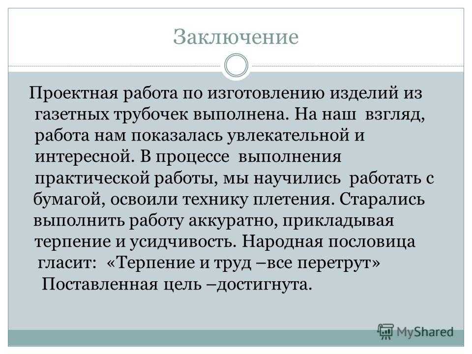 Заключение Проектная работа по изготовлению изделий из газетных трубочек выполнена. На наш взгляд, работа нам показалась увлекательной и интересной. В процессе выполнения практической работы, мы научились работать с бумагой, освоили технику плетения. Старались выполнить работу аккуратно, прикладывая терпение и усидчивость. Народная пословица гласит: «Терпение и труд –все перетрут» Поставленная цель –достигнута.