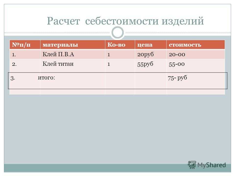 Расчет себестоимости изделий п/п материалы Ко-воценастоимость 1. Клей П.В.А120 руб Клей титан 155 руб итого: 75- руб